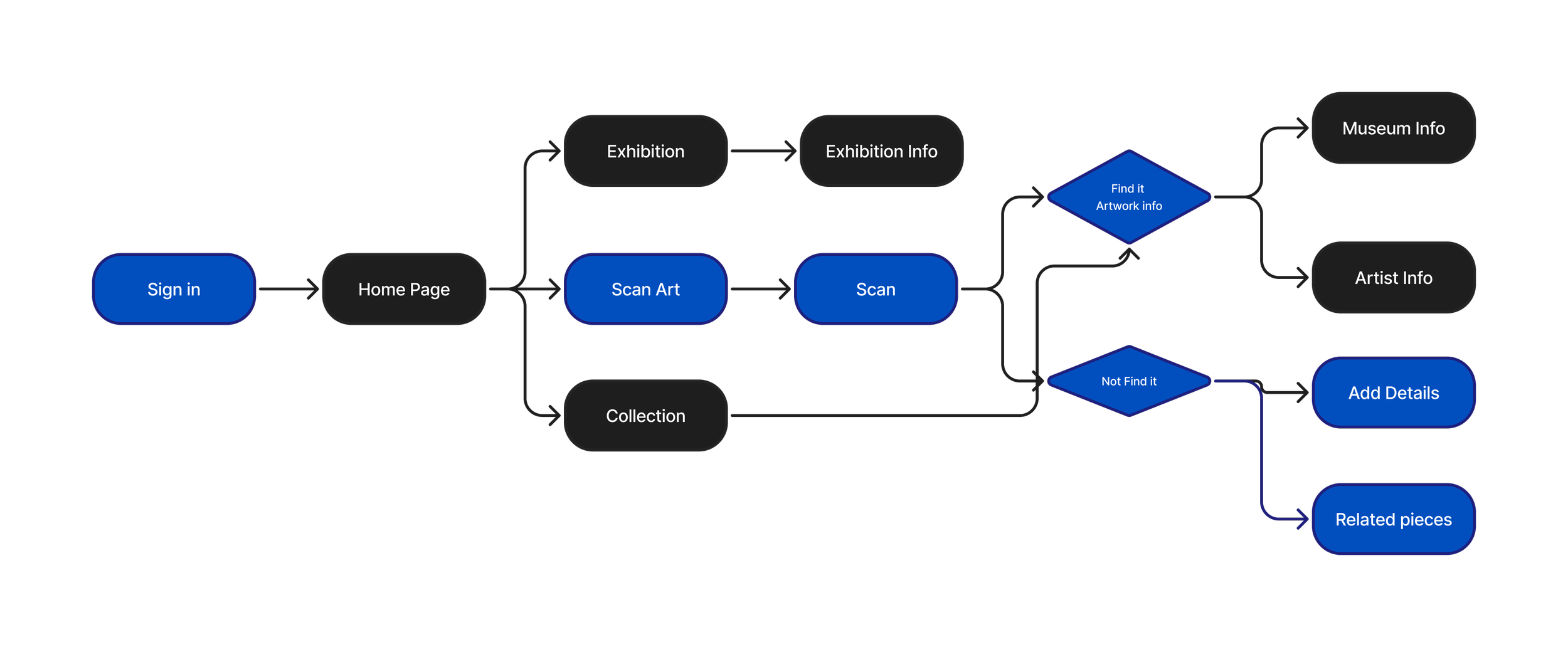 The user flow ensures a seamless journey from scanning a painting to discovering its story, making the experience intuitive, engaging, and accessible. By simplifying each step, the design transforms casual viewing into meaningful interaction with art.