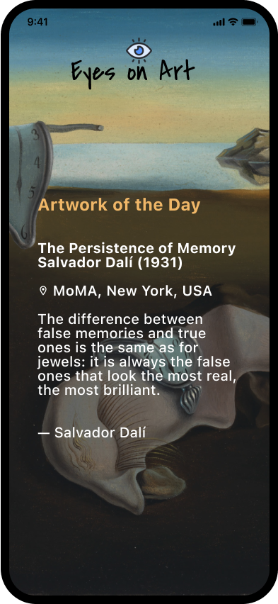 Eyes on Art bridges the gap between curiosity and knowledge by transforming any painting into an interactive learning experience. It is a visual recognition app that makes art both accessible and engaging: by scanning a painting, users can instantly discover its title, artist, medium, story, and museum location—turning every artwork into a moment of learning and connection.