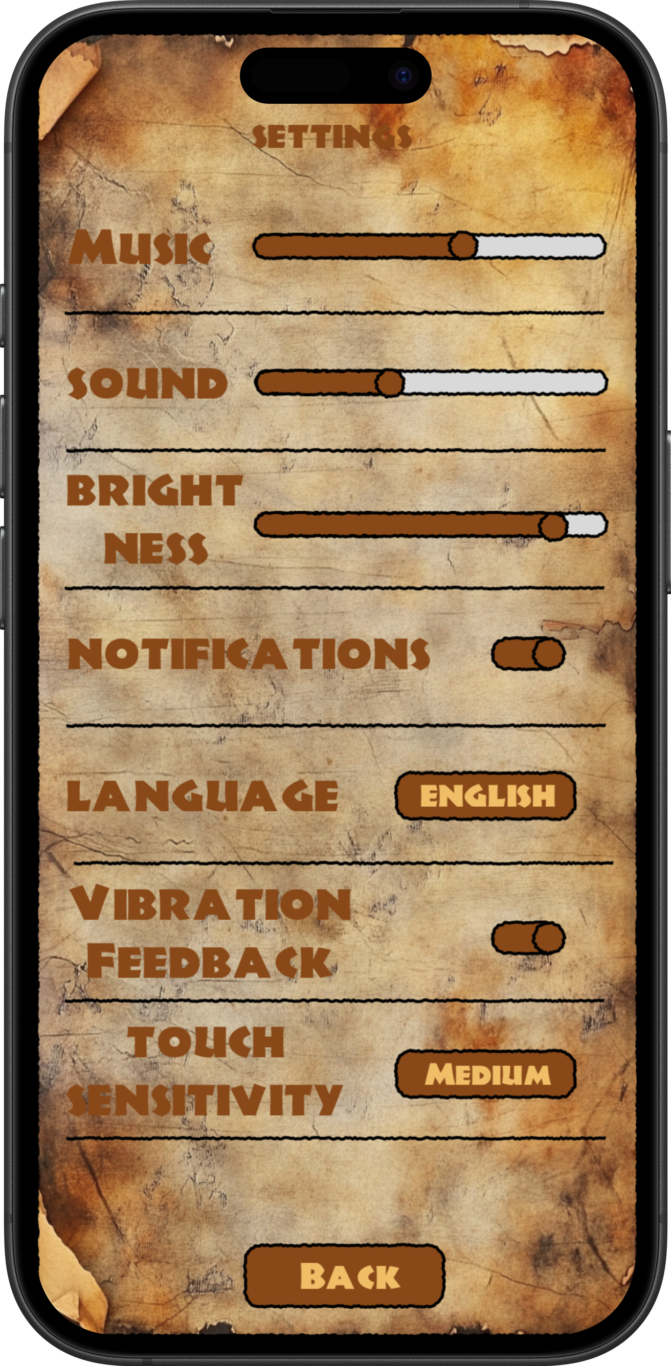 The Settings page lets players customize their experience with adjustable music, sound, and brightness controls, toggle notifications and vibration feedback on or off, switch between German, English, or Chinese, and fine-tune touch sensitivity to low, medium, or high.